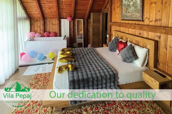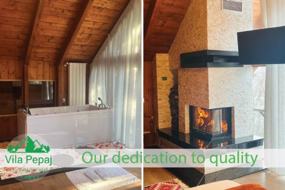 - Vila është e ndërtuar dhe e areduar tërësisht nga druri, që mysafirët tanë të ndihen sa më afër natyrës dhe të shijojnë një kënaqësi dhe rehati që mund të gjejnë vetëm brenda një vile nga druri e ngritur brenda një pylli.